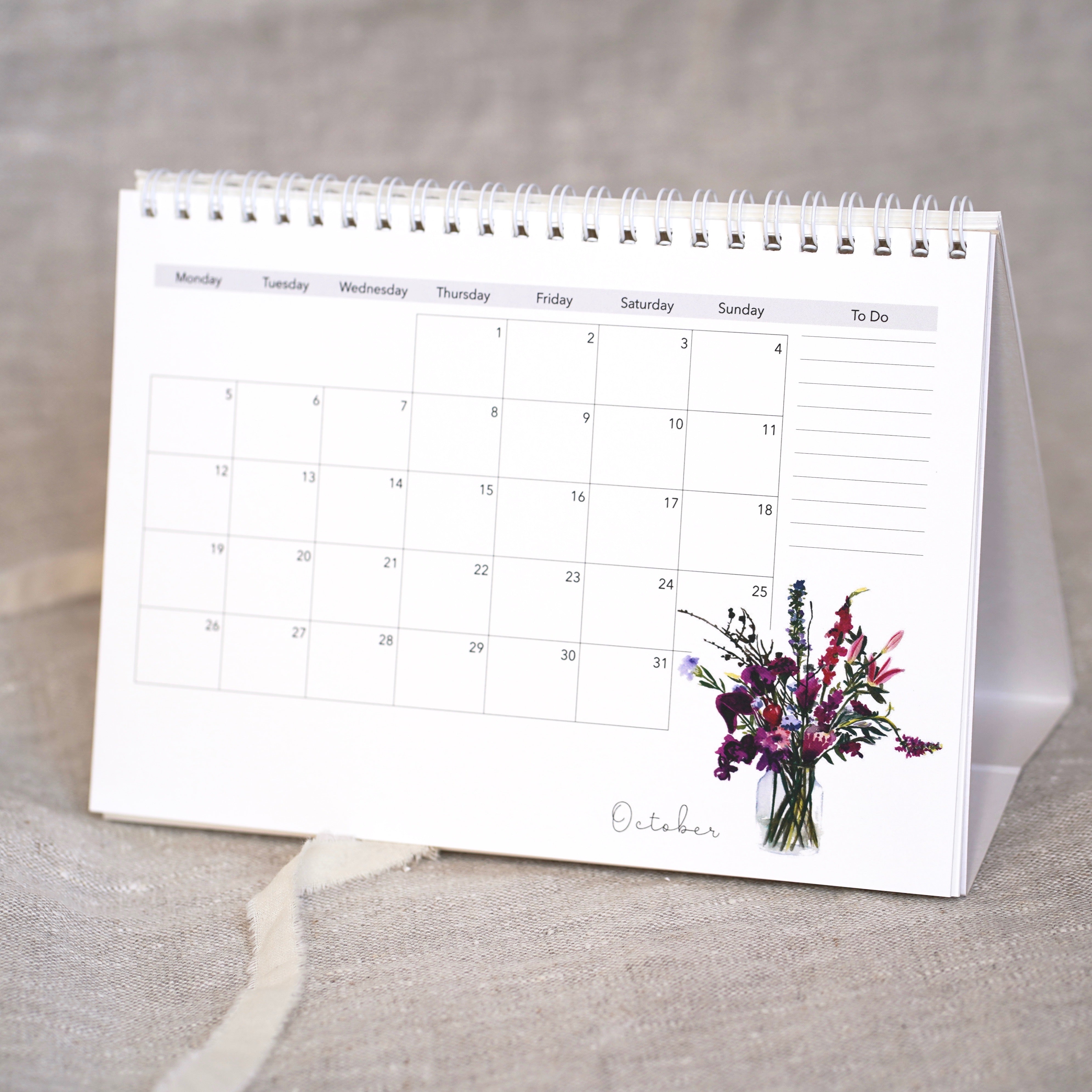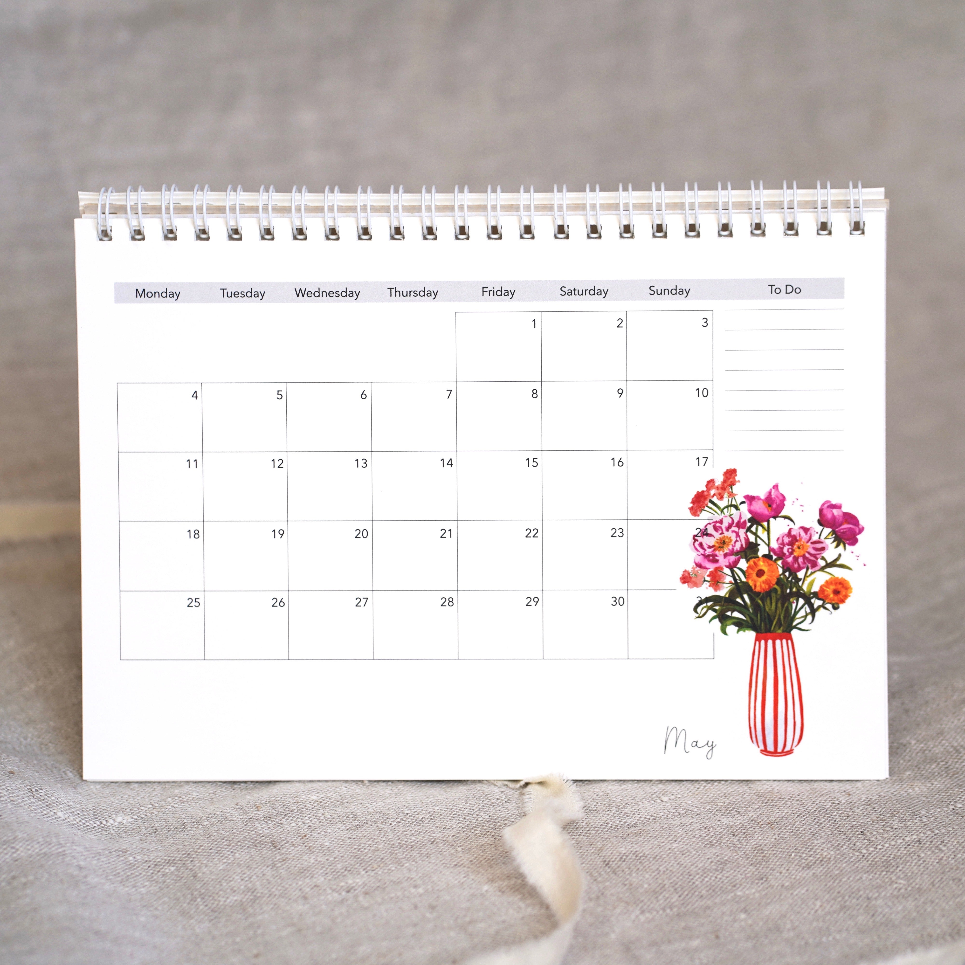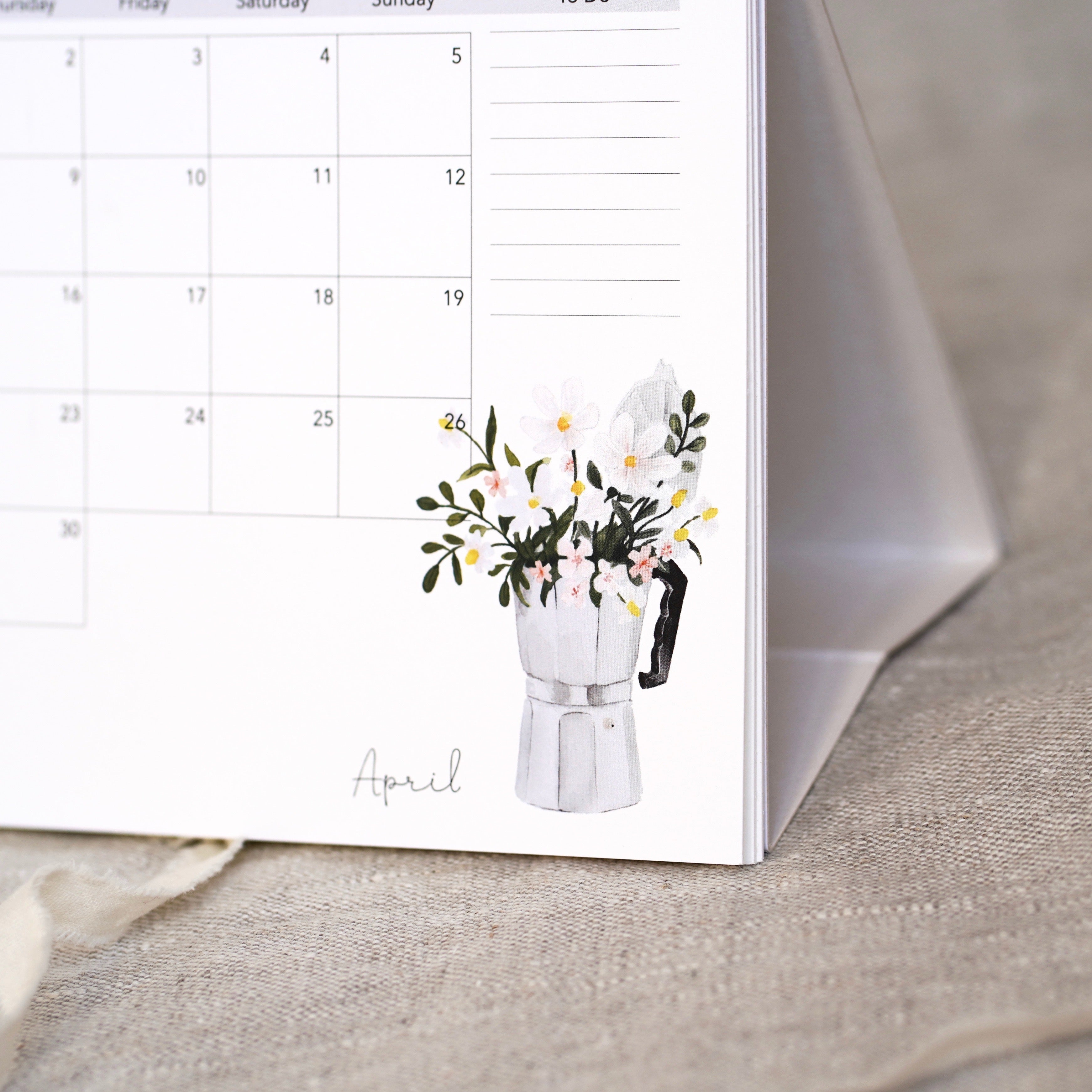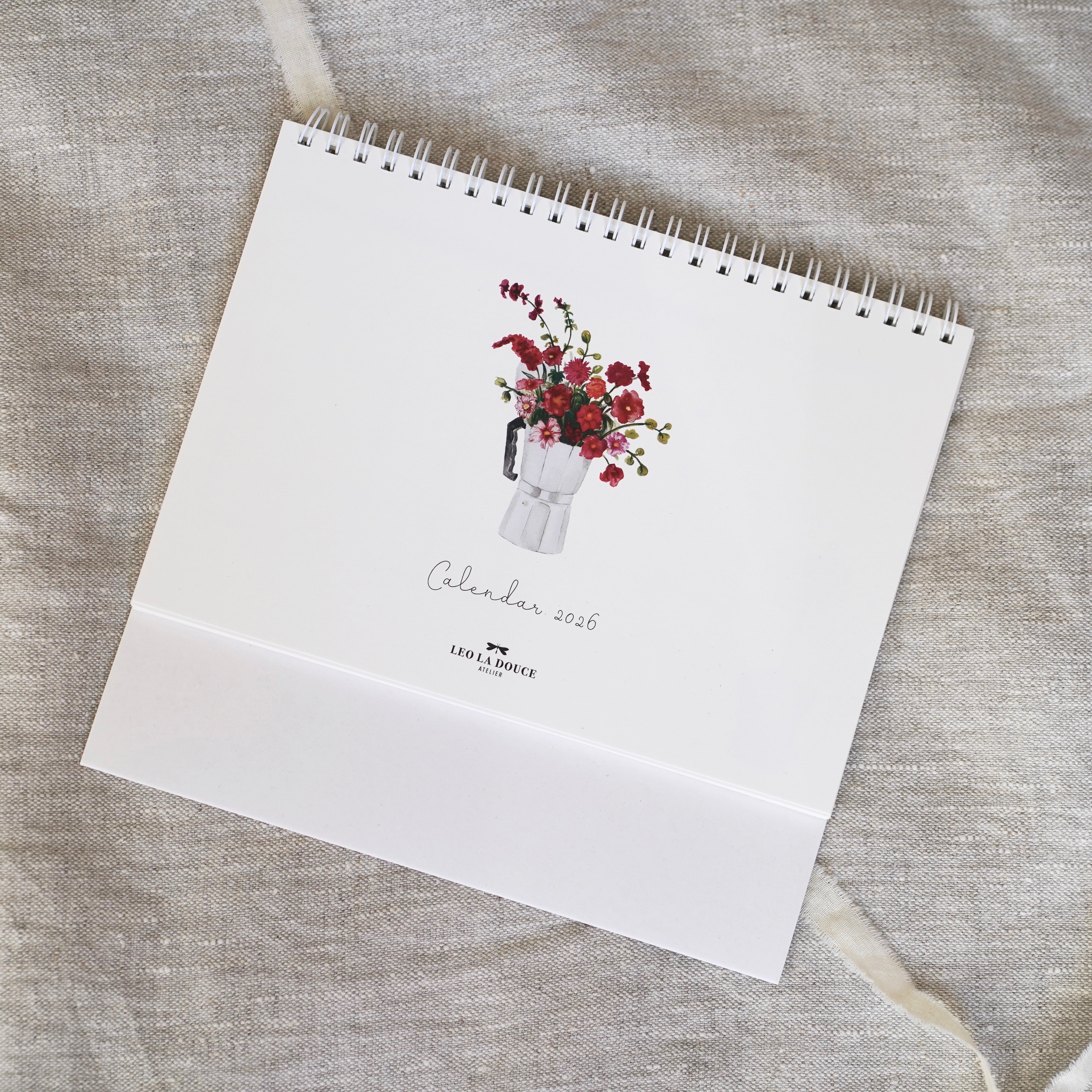 Der Kalender beinhaltet 12 von Hand aquarellierte Illustrationen zum Thema Blumen. Die Blumensträuße spiegeln die verschiedenen Jahreszeiten in ihrer Farbgebung wider.