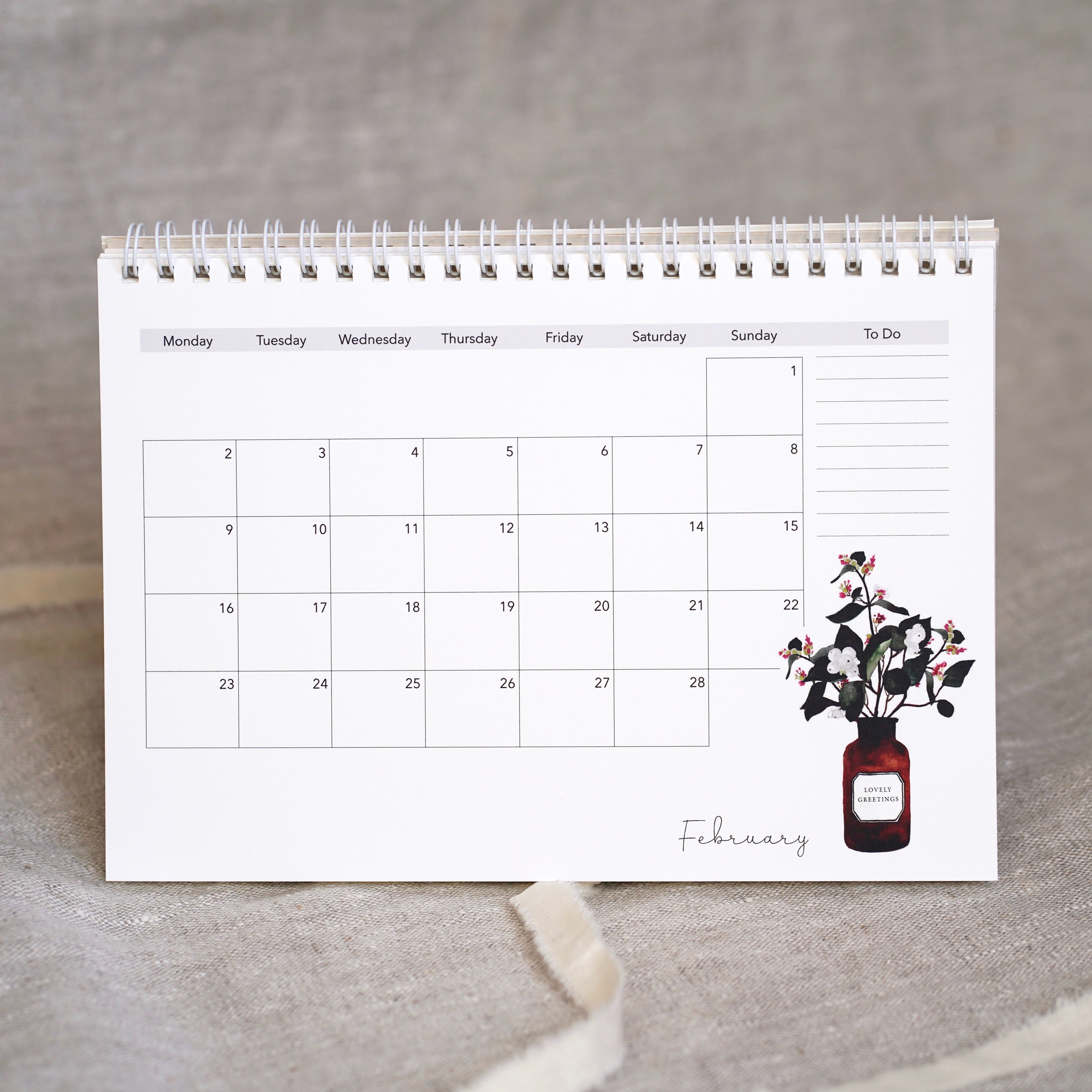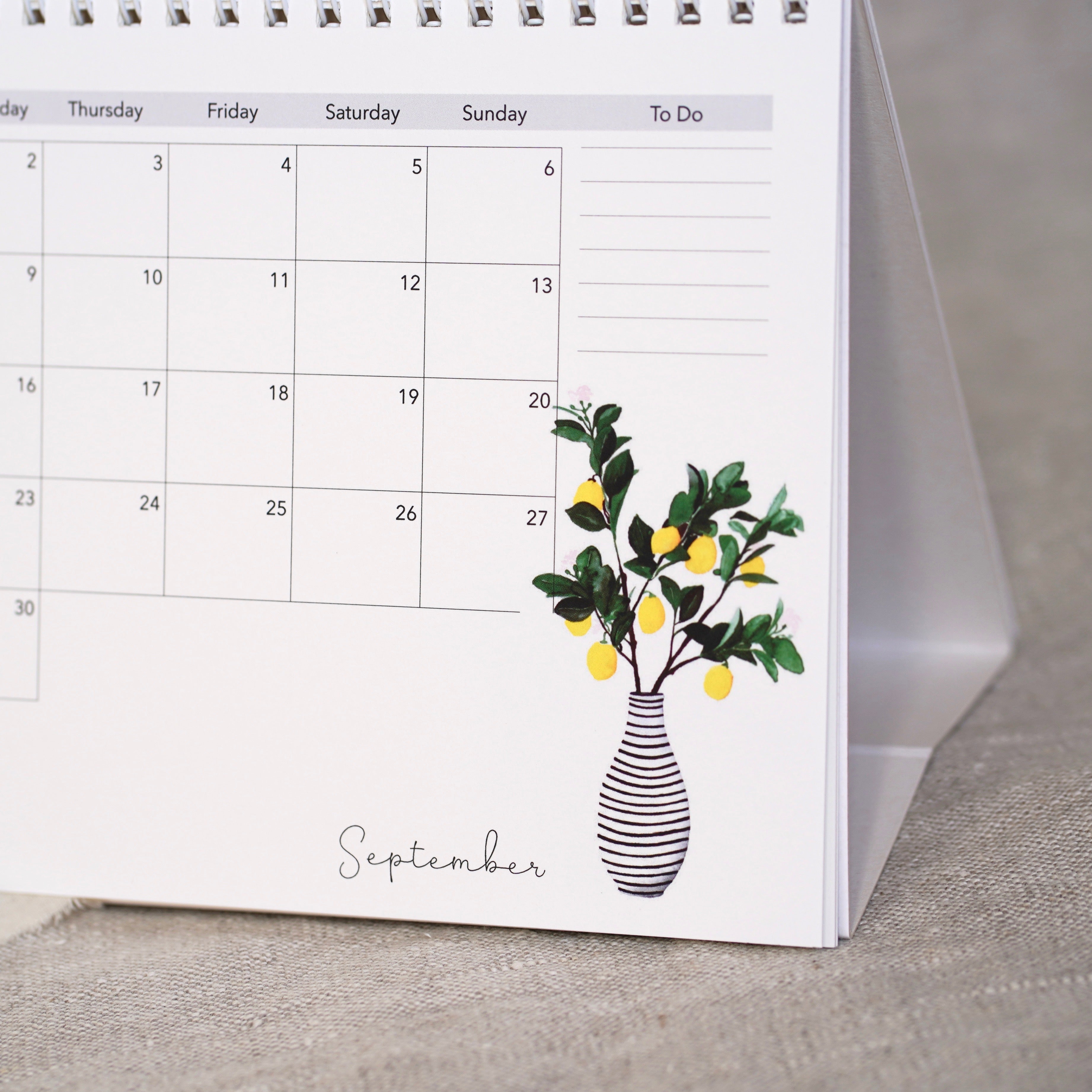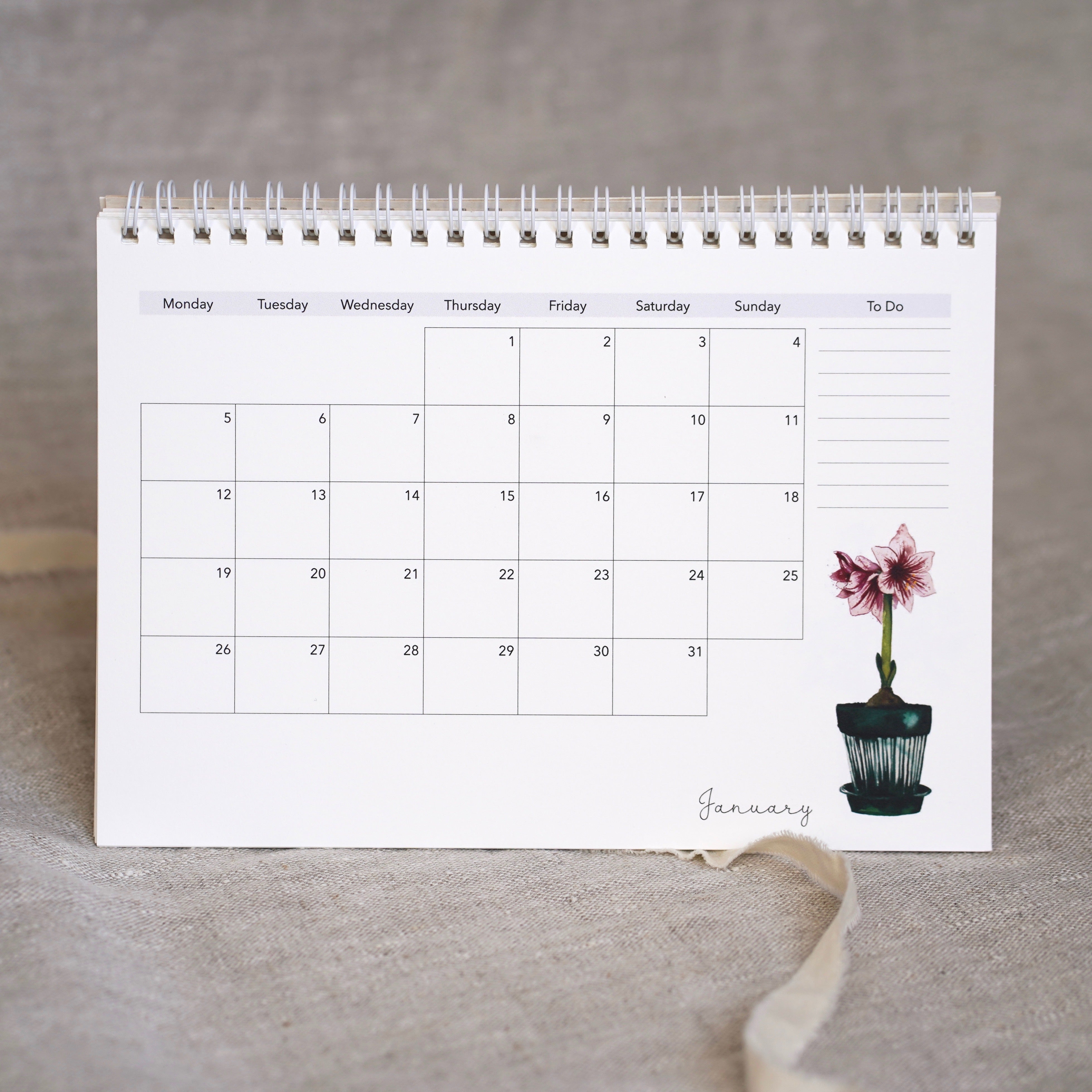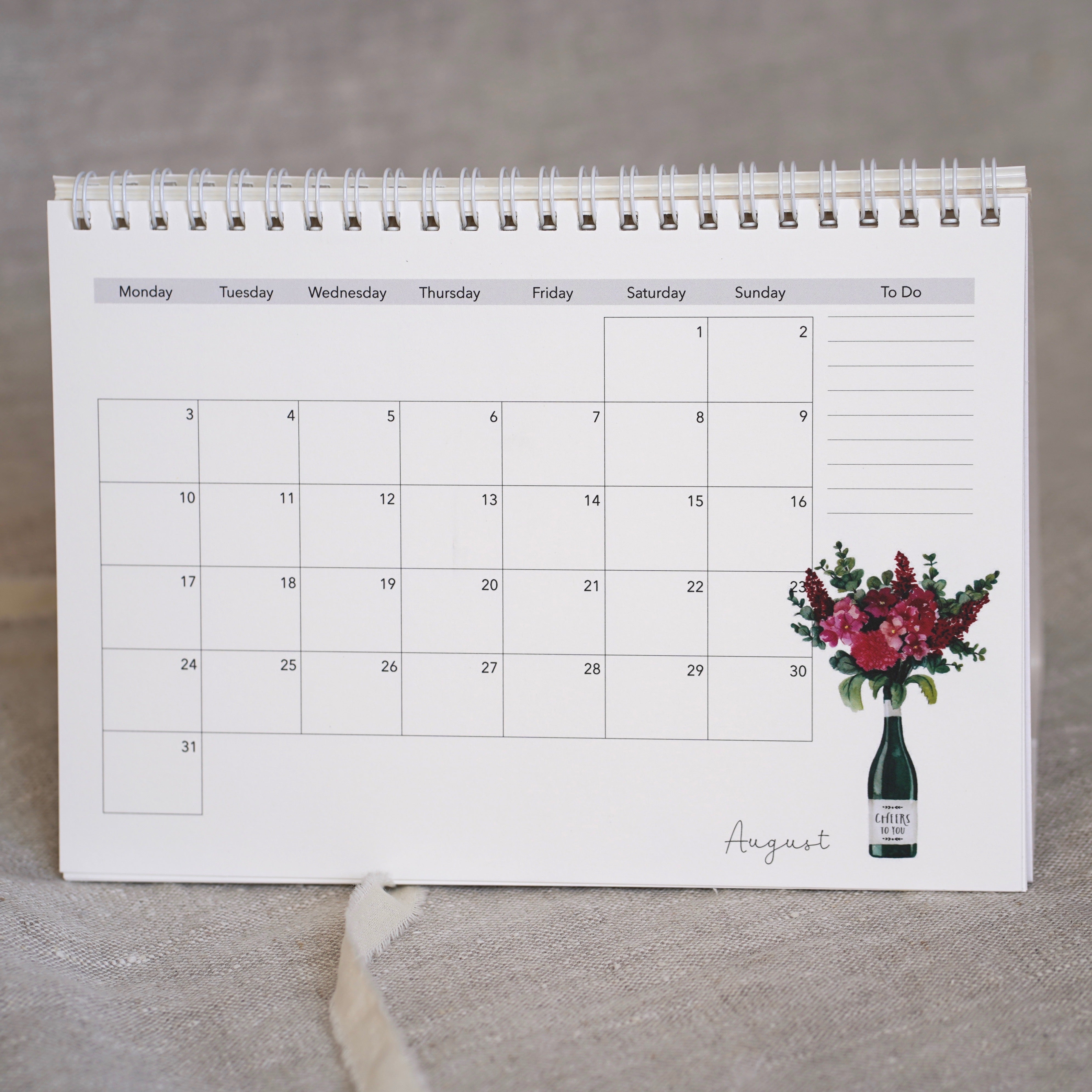 Der Kalender beinhaltet 12 von Hand aquarellierte Illustrationen zum Thema Blumen. Die Blumensträuße spiegeln die verschiedenen Jahreszeiten in ihrer Farbgebung wider.